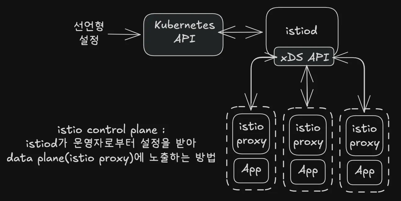 Istiod(control plane)에서 쿠버네티스 이벤트를 감지하고 이와 관련된 설정을 각 프록시에 푸시한다. 파드의 모든 네트워크는 프록시를 통해서 제어되기에 최종적으로 istio는 허용되는 모든 트래픽을 제어할 수 있다.